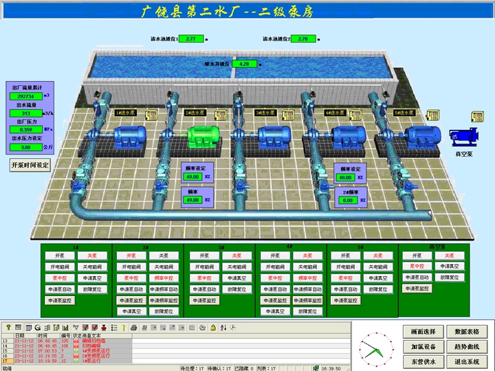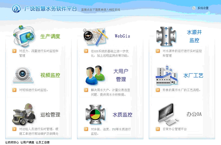 工程規(guī)模:設計規(guī)模3.5萬噸/日,新建水源井10座,改建原一廠水源井9座,均采用在線遠程監(jiān)測、控制。水廠采用地下水-清水池-消毒-二級泵房的處理工藝。綜合運用GIS技術、CAD技術、數據庫技術、網絡技術、管網綜合調度系統(SCADA),建設了廣饒縣GIS給水管網地理信息系統,實現城市給水管網數字化全覆蓋,實現了城市給水全生產過程的信息化管理。