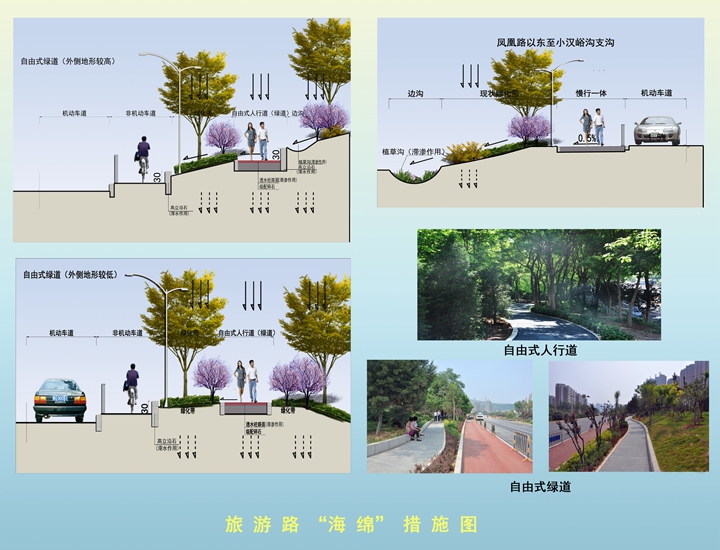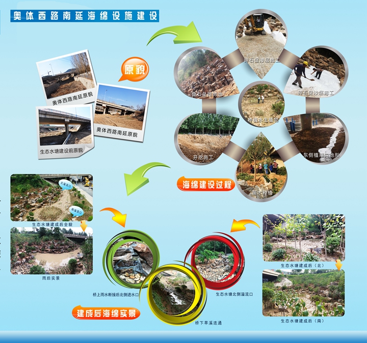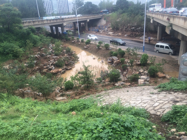 奧體西路南延原為斷頭路,道路紅線范圍及東西側(cè)空間原狀均為荒地,旅游路北橋北側(cè)原為大辛河支溝上游河道。結(jié)合本次奧體西路南延道路工程建設(shè),充分落實(shí)海綿城市建設(shè)理念,重點(diǎn)對(duì)橋下空間因地制宜進(jìn)行挖潛,精心設(shè)計(jì)建設(shè)了1500余平方的生態(tài)水塘、植草溝、旱溪等海綿工程設(shè)施。通過(guò)對(duì)旅游路部分路段雨水進(jìn)行斷接,使上游區(qū)域雨水先進(jìn)入生態(tài)水塘等設(shè)施進(jìn)行生態(tài)凈化和下滲,滲后多余的雨水再溢流進(jìn)入大辛河支溝,徹底改變了該路段原有的雨水直排模式。